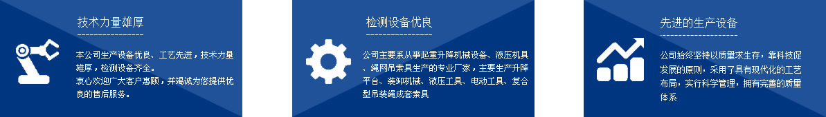 本公司系從事起重升降機械設備、液壓機具、繩網吊索具生產的專業(yè)廠家,主要生產千斤頂、液壓拉馬、軸承加熱器、升降平臺、裝卸機械、液壓工具、電動工具、復合型吊裝繩成套索具、高強纖維柔性吊裝帶、起重鏈條成套索具、橫梁吊具、注塑繩、軟梯、安全帶、安全網等幾大系列、上百種規(guī)格的產品,廣泛應用于電力、油田、大型鋼廠、機電、化工、航空、冶金、機械、鐵道、造紙、港口、建筑等領域。